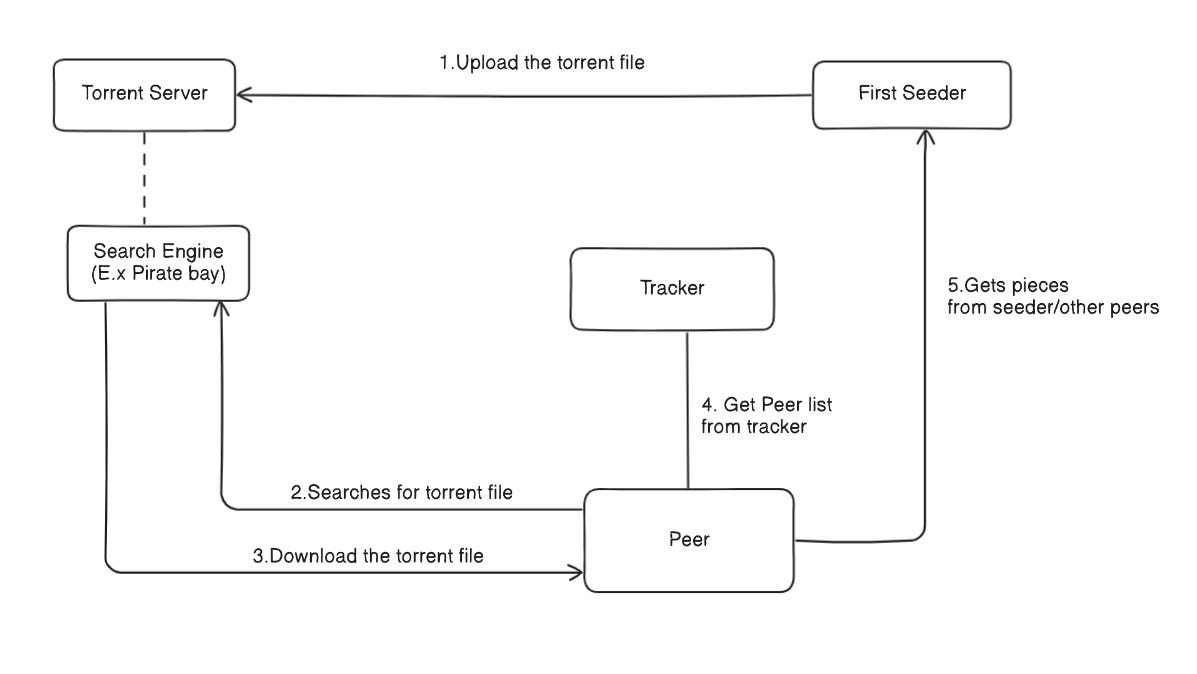 The above diagram outlines the process of torrent file sharing and downloading in a peer-to-peer (P2P) network. Here's the flow explained step by step: